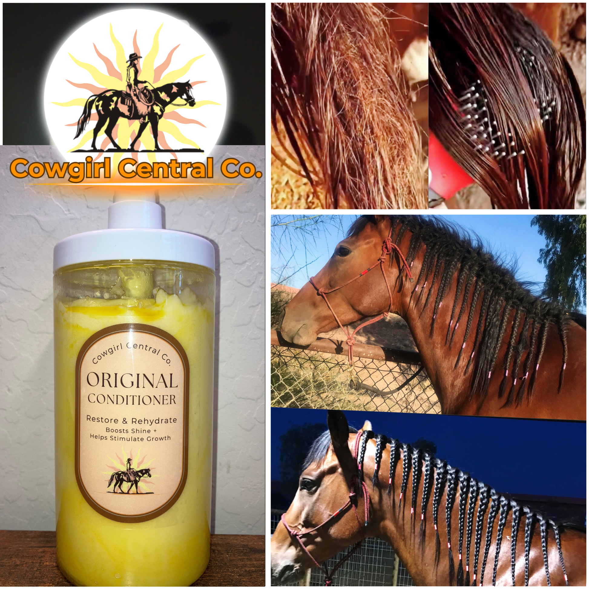 Complete your horse grooming routine with our luxurious Cowgirl Central Co. Conditioner, expertly formulated to complement our Cowgirl Central Co. Shampoo and provide unparalleled hydration and shine. Crafted with care and designed to combat the dry conditions of Arizona's climate, this conditioner nourishes and revitalizes your horse's mane, tail, and coat for a lustrous, healthy appearance.